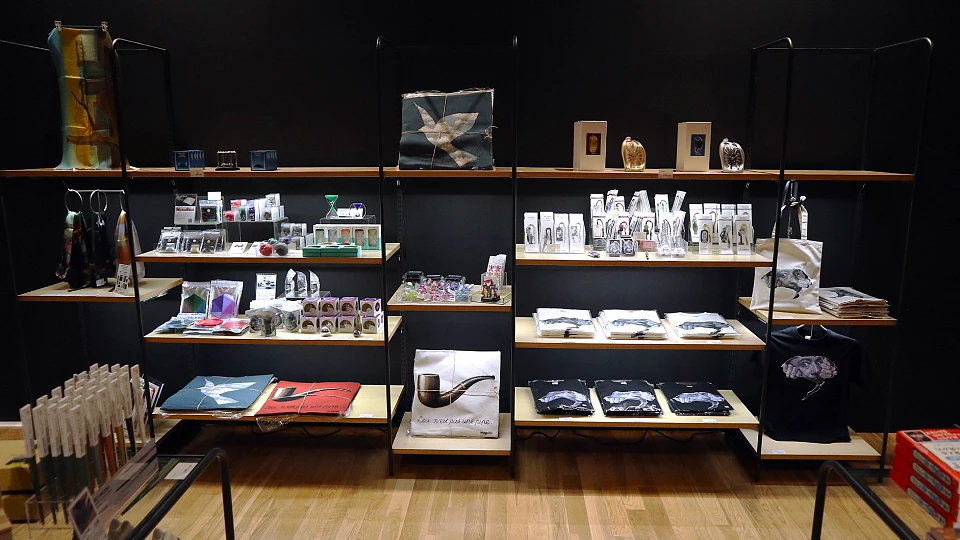 展示会場を抜けると、恒例のグッズショップがお出迎え。ふと感じたのは、アイテムのセンスの良さ。ちょっと不思議な気分のシュルレアリスムをモチーフにしながらも、インテリアやアクセサリにフィットしてくれるスーベニアに出会えそうです。