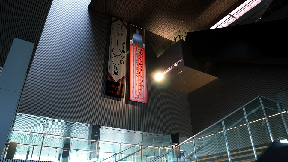 チタンシルバーの巨大なロビーは、まるで映画の中にいるような超現実感覚。見上げた先の大型タペストリーには、あの謎の男が!フロアへのエスカレータが昇っていくほどに期待が高まります。