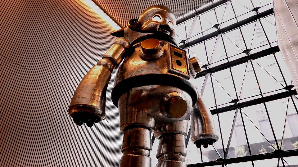暁の中之島に現れたのは、悪の組織の巨大ロボット?