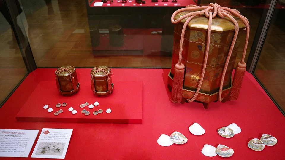 これは貝桶・合貝という、姫君たちの遊び道具。貝殻の対を探す遊びだったんですって。