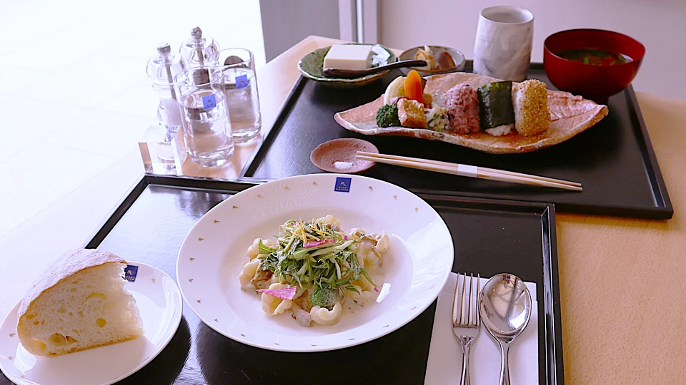レセプション棟のレストラン「ピーチバレイ」にて (奥)おむすび膳(手前)レモン香る きのこのカシュークリームパスタ