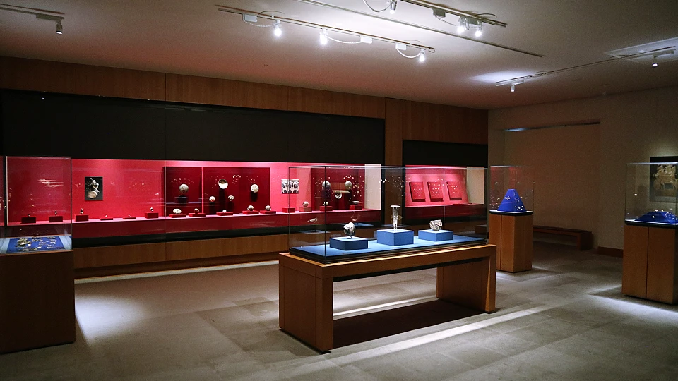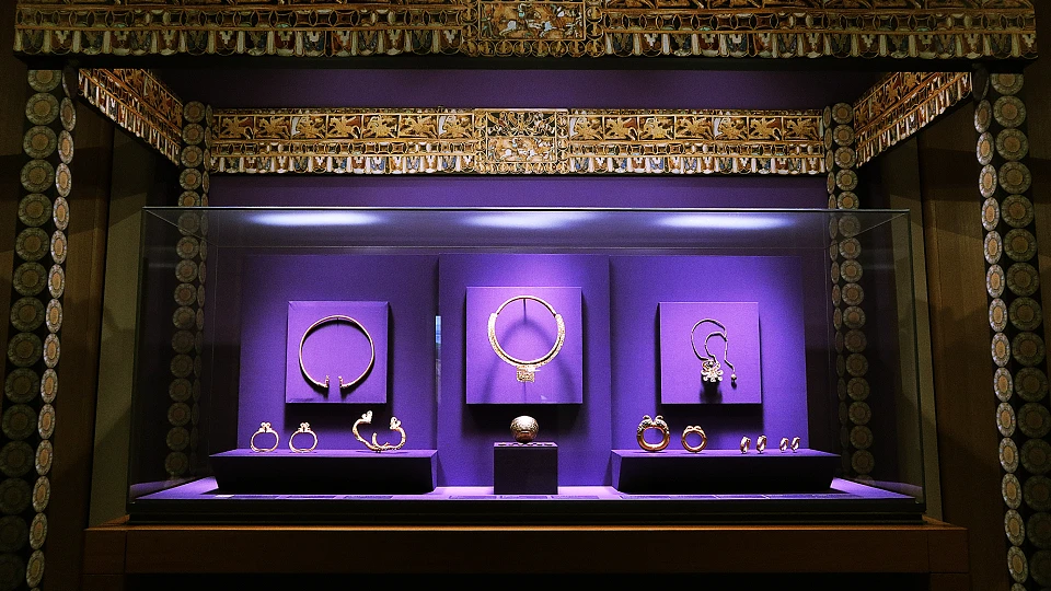 ブレスレットやトルク、ペンダントなど重厚でありながら精緻な細工が施された美しい黄金が展示されています。