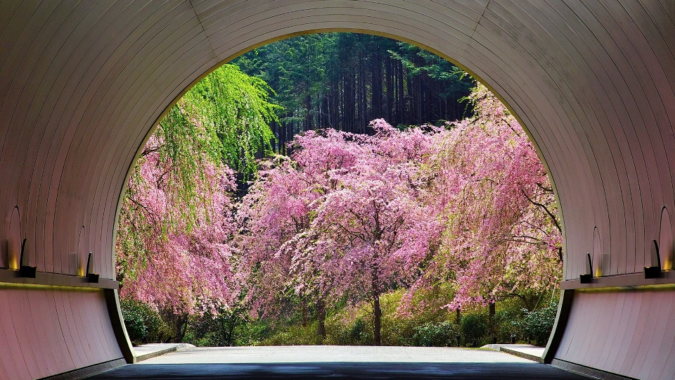 MIHO MUSEUMのエントランス棟から美術館棟をつなぐトンネルの向こうに見えるのは、見事な枝垂桜。