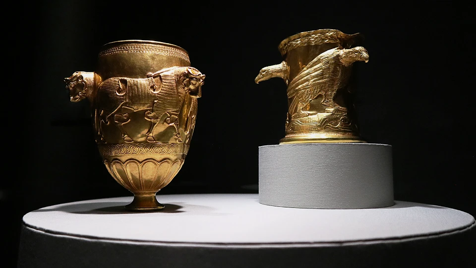 副葬品であるこれらの杯は、猛禽は死穢を祓い、角を突き出す牡牛は魔除けの意味を持つと考えられています。