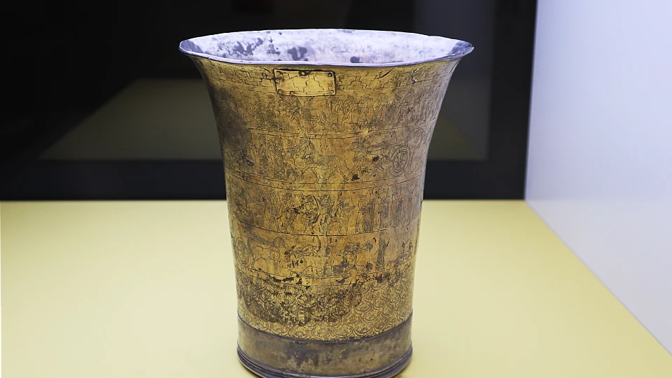 銀に金メッキを施したこの杯は、オリエント最古の世界帝国を築いたアッシリアのもの。